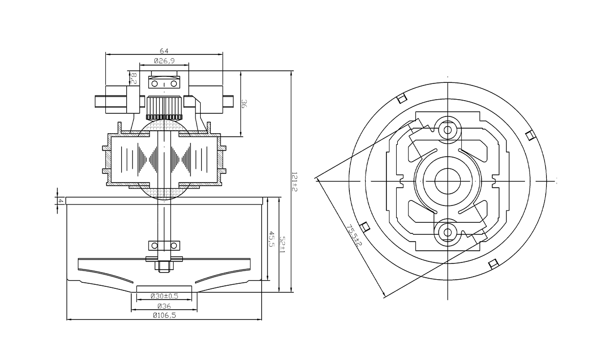 • 106.5mm diameter , 600-800W cooper wire vacuum motor